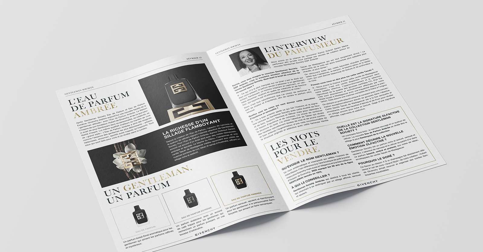 L’agence crée une gazette retraçant l’histoire de son emblématique parfum, une interview exclusive du parfumeur et des focus sur la nouveauté.